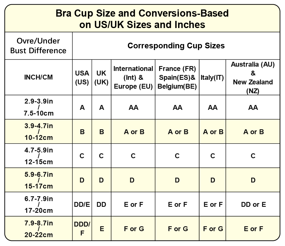 Cup sizes: A, B, C, D, DD (E), DDD (F)